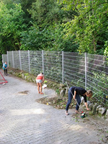 Es geht um das Bauen einer Sitzecke mit Bank, Schneiden von Bäumen und Büschen, Unkraut entfernen, Basketballkörbe reparieren und putzen, Türen und Tore streichen, Ballfangnetze aufstellen.